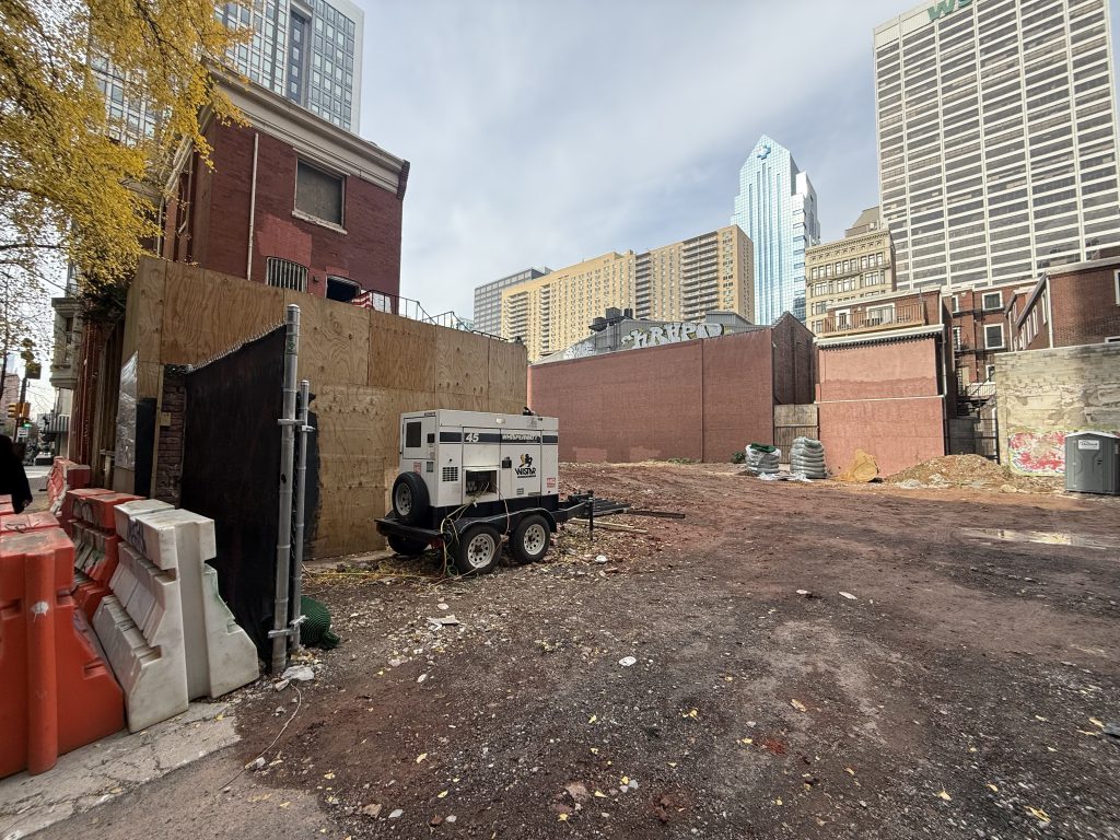 The OG Cavanaugh’s and other businesses on Sansom by 19th Street are long gone to make way for Pearl Properties‘ Harper 2.0. Completion is a LONG way off —as the photos show— but an infusion of investment capital recently completed and we’re seeing signs of life (i.e, construction equipment moving in) at the long-dormant location (shocking, we know!)
