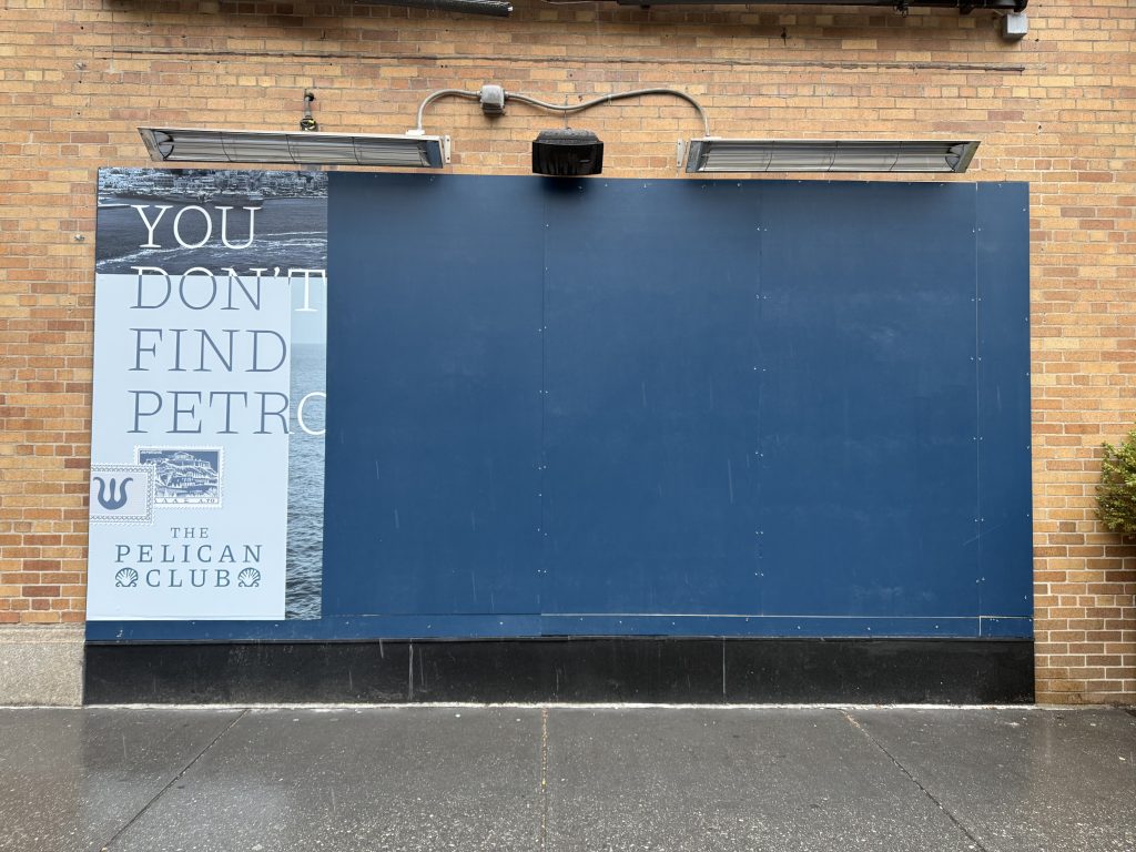 A banner appeared at 225 S. 18th Street — the nearly 9,000-square-foot space that Devon Seafood called home for 25 years — and it reads “YOU DON’T FIND PETRO…” alongside a trident logo, shell motifs, a vintage coastal postcard, and the name The Pelican Club the day before they did the full reveal: